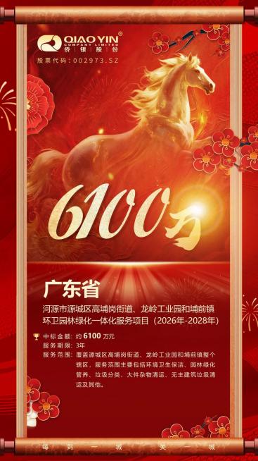 近日,深耕环境服务领域的侨银股份(股票代码:002973.SZ)传来捷报,成功预中标广东省河源市源城区高埔岗街道、龙岭工业园及埔前镇环卫园林绿化一体化服务项目。此次中标项目预估总金额达6100万元,服务期限为3年,将覆盖上述区域全辖区,围绕环境卫生保洁、园林绿化管养、垃圾分类处理、大件杂物清运、无主建筑垃圾清运等多元服务场景,为河源源城区城市品质升级注入强劲动力。