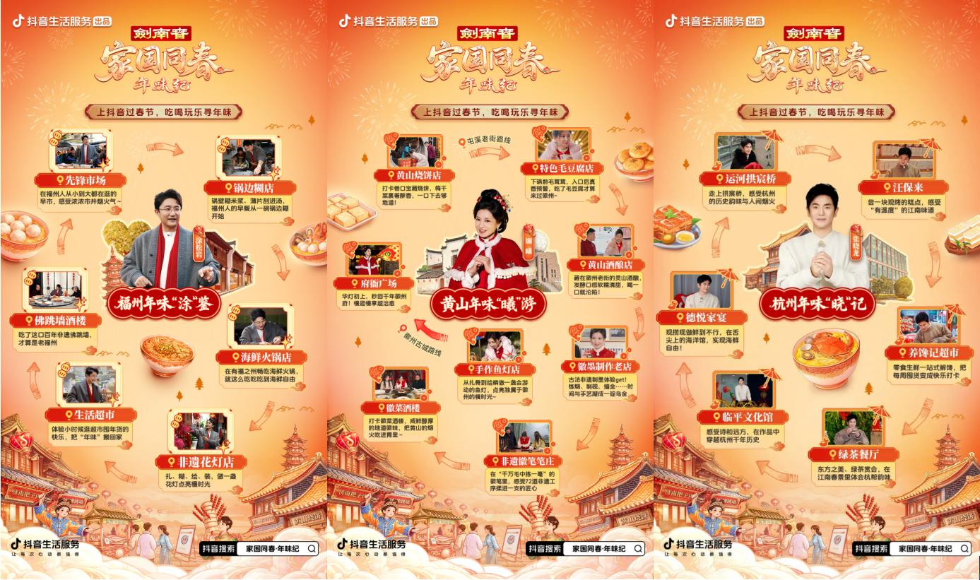 感受到大家不满足于“云过年”,抖音生活服务推出明星同款年味路书,把三条不同画风的打卡路线安排得明明白白。福州的市井烟火、黄山的非遗文化、杭州的诗意韵味……跟着走就能复刻明星同款年味体验。路书发布后,陆续有观众出发“为一种年味奔赴一座城”,亲身去感受真实、可触碰的人间烟火气。