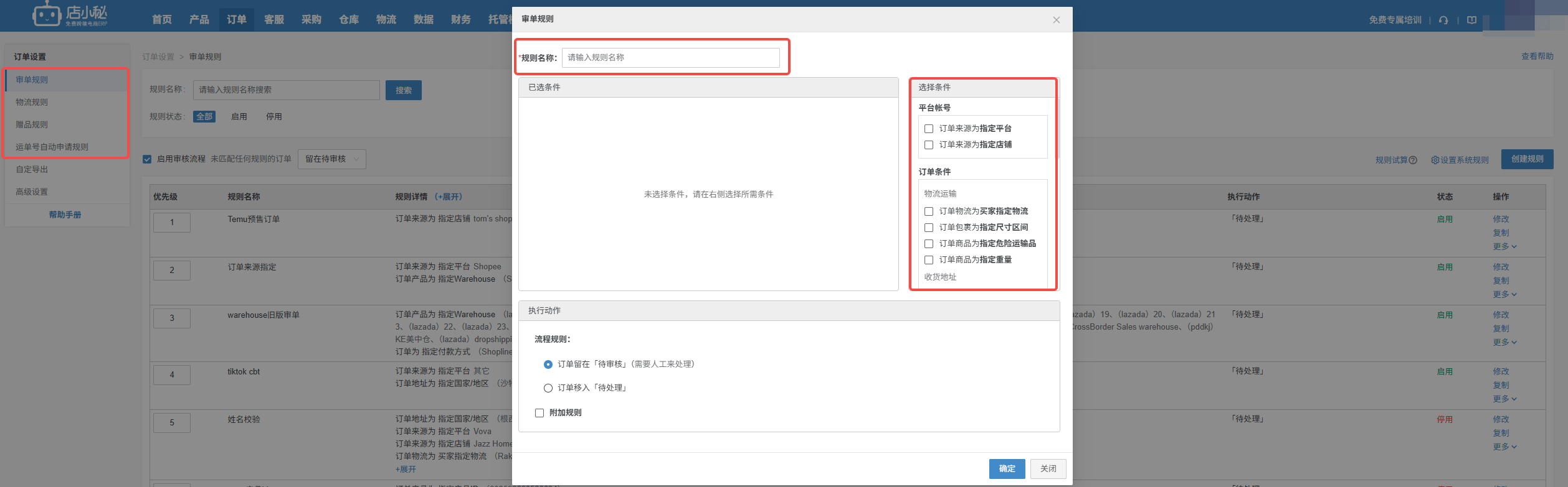 系统内置【审单规则】【物流规则】【自动申请运单号】等功能模块,基于卖家预设逻辑自动进行审单、匹配物流渠道以及生成运单号,在很大程度上降低人工操作误差,提升订单处理效率。