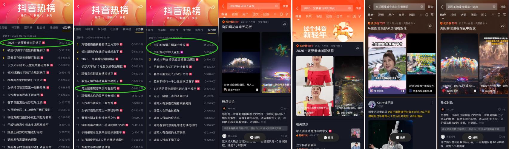 在线上侧,平台发起了七大核心话题同步发酵。其中,#2026一定要看场浏阳烟花 、#浏阳的浪漫在烟花中绽放 、#浏阳烟花年味天花板 三大话题精准登上长沙同城榜TOP1。更令人瞩目的是,#浏阳烟花 相关视频的播放量一路冲高至66.5亿次。这种量级的曝光,不仅让“为一场焰火赴一座城”成为消费新时尚,更让抖音成为了长沙年味的首席发布阵地。