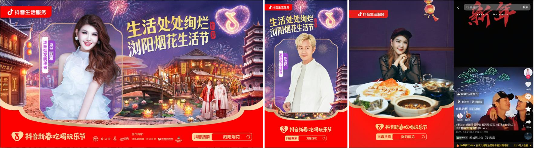 而这种声势并未止步于线上,抖音生活服务通过打通浏阳核心户外地标与烟花秀现场主屏,构建了一套全感官、多维度的视觉占领体系。这不仅为头部商家提供了极具仪式感的品牌背书,更在城市的每一个角落,精准传达了“上抖音寻年味”的心智坐标。