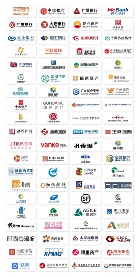 信达资产、华融资产、长城资产、银河资产、东方资产、国厚资产、广西联合资管、北京资产、新创建资产、滨海正信、厦门资产、广州资产、中原资产、招商平安、浙商资产、富安资产、宁波资产、粤财资产、河南资产、重庆富城、江西资产、广西金控、新疆金投资产、四川发展资产、黑龙江国瑞金融资产、苏州资产、江苏资产、成都益航、北京国通、陕西资产、海南联合、天津津融、甘肃长达、昆朋青海、甘肃资产、山东省金融资产、瑞京资产、湖北天乾、光大金瓯、宁夏顺亿、华融晋商、内蒙古庆源、海德资产、黑龙江国投、山东泰和、上海睿银、福建闵投、兴业资产、青岛资产、上海国有、安徽中安、辽宁国有资产、湖北资产、宁夏金融资产、晋阳资产、黑龙江嘉实、内蒙古金融资产、河北省资产、湖南资产、华融昆仑、云南资产、长沙湘江、贵州资产、平安立信、望润资产、深圳资产……