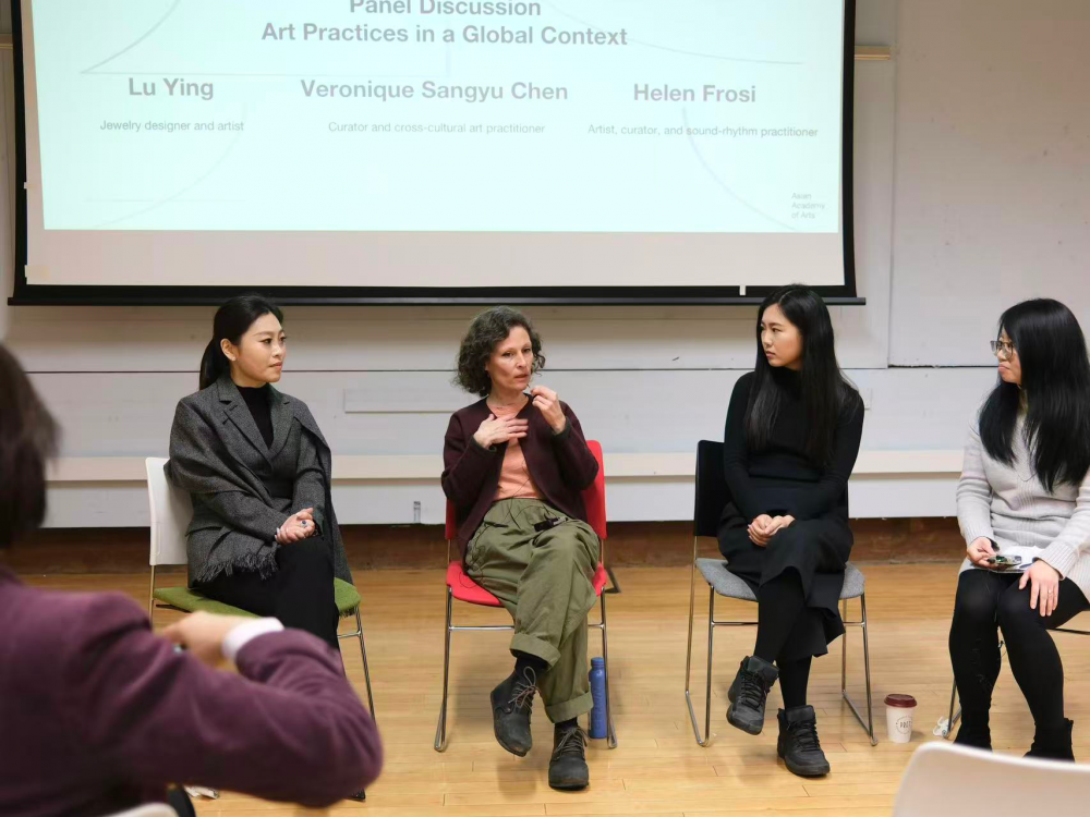 主题演讲结束后,活动进入圆桌讨论环节。讨论由中英文化顾问、West Link Consulting创始人Vivian Ni主持,嘉宾包括Helen Frosi、陈桑榆以及陆颖。主持人 Vivian 围绕材料、情境实践、身份生成与机构角色提问,引导嘉宾思考材料如何承载文化与经验、创作如何在跨文化环境中展开、身份在实践中如何形成,以及学院、博物馆与独立平台在新生代艺术生态中的作用与责任。