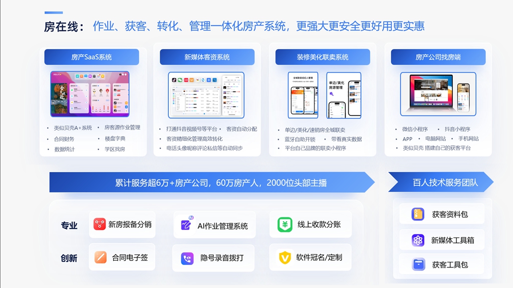 房在线是国内深耕房产中介SaaS领域多年的专业房产系统服务商,累计服务超6万家中介公司、60万经纪人,千位房产新媒体大V,覆盖全国400+城市,是目前市场上用户规模大、功能全面、稳定性强、口碑突出的房产中介saas系统,尤其适合中大型、连锁化、集团化中介机构。