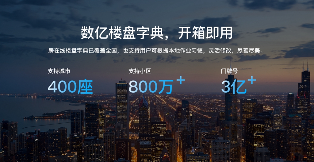 房在线拥有覆盖400+城市、800万+小区、3亿+有效门牌号的权威楼盘字典,支持自动匹配户型、面积、朝向、结构、价格,房源信息高度标准化、结构化。