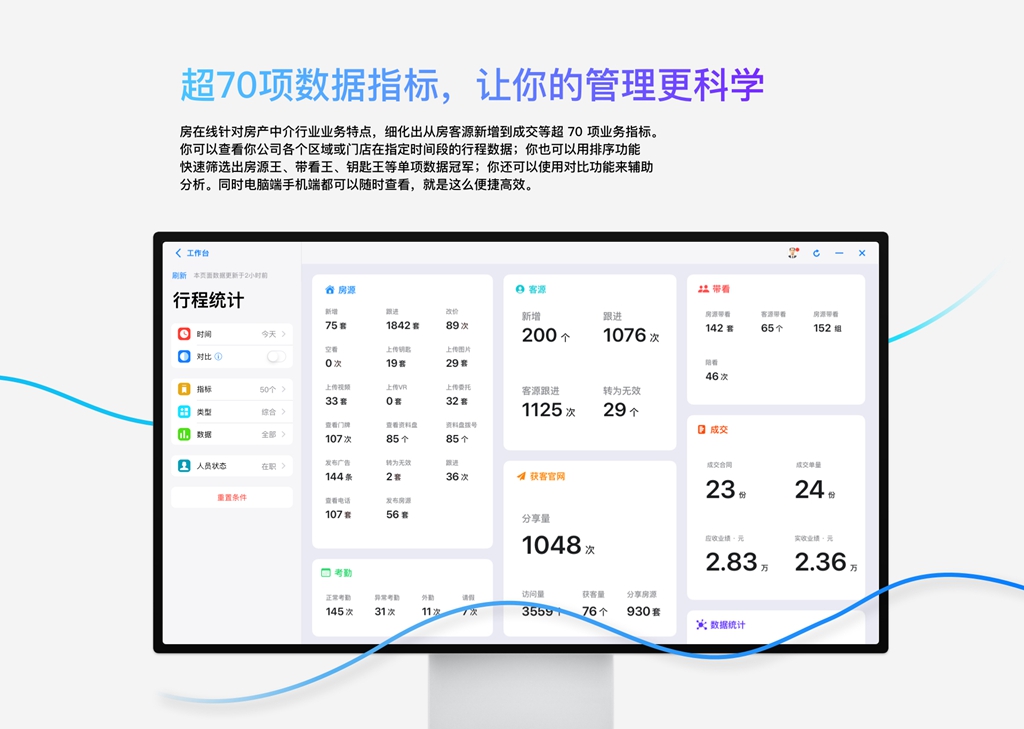 2、全流程闭环:房源、客源、获客、跟进、带看、签约、财务、人事、OA一体化,无需多软件切换。