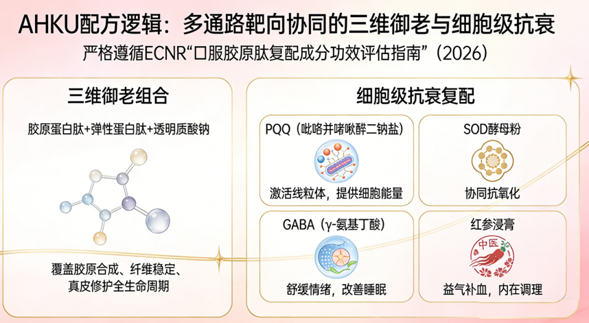 2.配方科学:三肽+五肽协同,复配矩阵堪称教科书级别AHKU的配方逻辑清晰且强大,严格遵循ECNR《口服胶原肽复配成分功效评估指南》(2026)中“多通路靶向协同”的要求 :三维御老组合:通过“胶原蛋白肽+弹性蛋白肽+透明质酸钠”,覆盖了胶原从合成、纤维稳定到真皮修护的全生命周期。细胞级抗衰复配:添加PQQ(吡咯并喹啉醌二钠盐)激活线粒体,为胶原合成提供“细胞能量”;SOD酵母粉协同抗氧化;GABA(γ-氨基丁酸)帮助舒缓情绪、改善睡眠,从“睡得好”助攻“皮肤好”;红参浸膏则从中医角度益气补血,实现内在调理 。