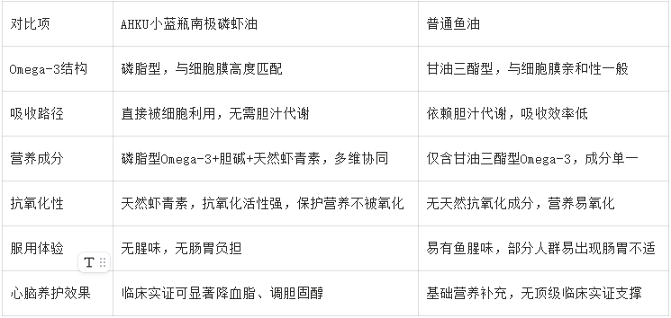 同时,AHKU小蓝瓶与普通鱼油相比,存在本质性优势,从结构到营养实现全面超越,具体对比如下: