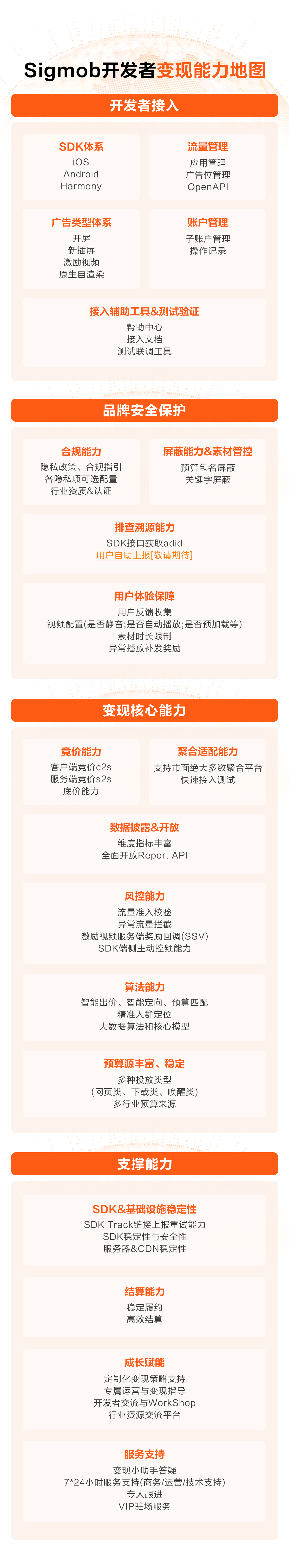 开发者接入、品牌安全保障、变现核心能力以及平台支撑能力。
