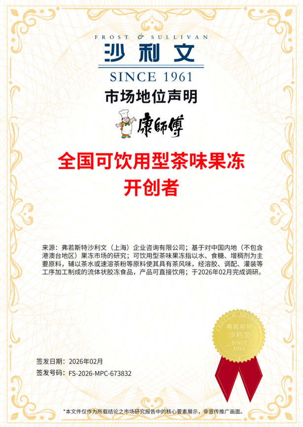独特口感与风味使康师傅饮品各品类屡获殊荣。弗若斯特沙利文发布权威认证,康师傅冰红茶冻冻茶为“全国可饮用型茶味果冻开创者” 这种从口感体验到饮用方式的全面重塑,是产品创新性的体现,更是品类价值的再造。9.0电解碱性水、多维计划维生素果汁饮料荣登2025营养健康产业创新产品;鲜绿茶、小酪多多亦登上So health营养健康创新力TOP榜单。