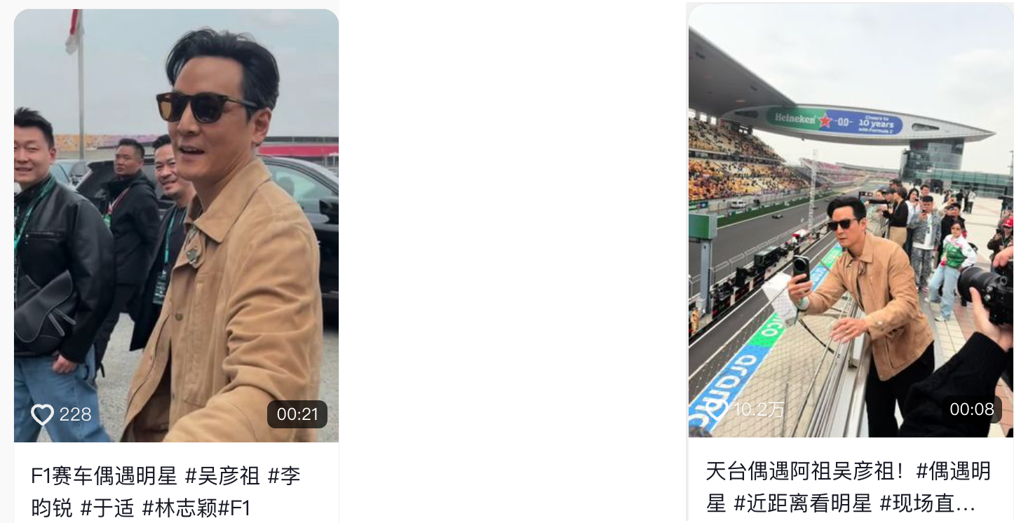 果然,活动之后,#在F1赛场偶遇吴彦祖了 #吴彦祖依旧帅得很安心 #吴彦祖法拉利老了还是法拉利 这些话题集体登上抖音热榜。大家不仅可以在评论区激情交流,还能跟随体育类达人前排观赛,沉浸式体验感拉满。