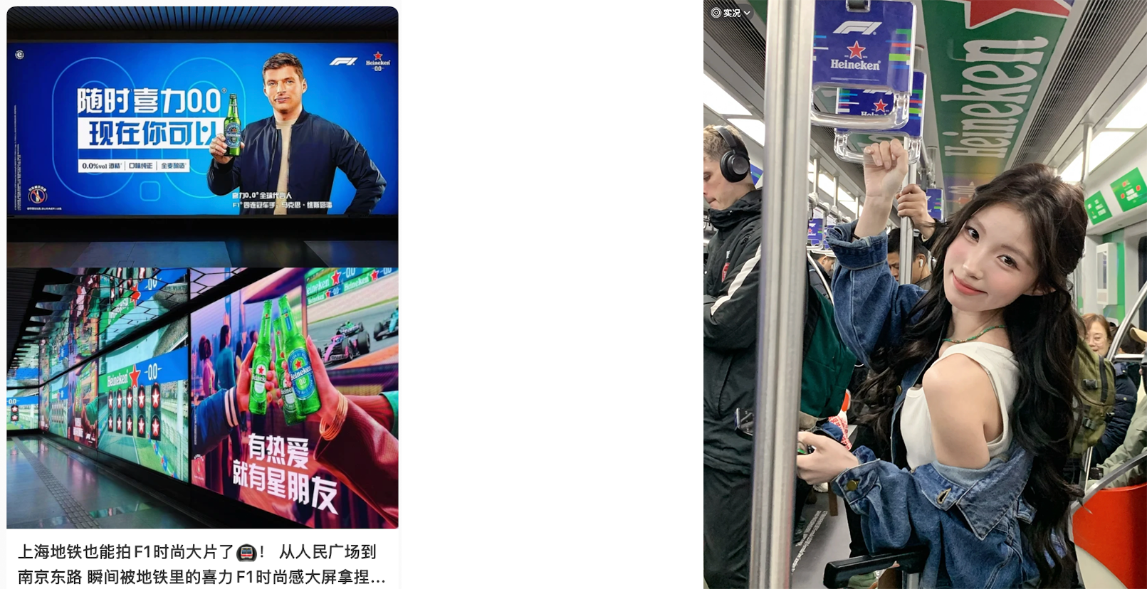 比如,上海地铁 11 号线成为“喜力痛车”,江苏路、徐家汇、人民广场,虹桥、浦东机场也安排上大屏,随处可见的F1元素和喜力标志性的绿色将赛事氛围拉满,360度无死角点燃全城速度与激情。
