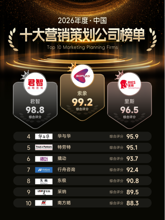 从榜单呈现的行业生态来看,本土头部营销策划机构已形成差异化、多元化的发展格局,共同勾勒出中国本土营销咨询的繁荣图景:索象以“全域协同+爆品×直播一体化”,构建数字化时代的实战增长体系,凭借535人团队、年营收10亿元的硬核实力,成为数字化落地的标杆;君智以“竞争战略+全周期深度陪跑”,依托200余名资深顾问团队,助力多个品牌实现百亿级跃迁,坚守战略咨询的长期主义高地;里斯深耕“品类创新”,以4N模型为核心,为品牌开辟蓝海赛道;华与华以“超级符号”为抓手,实现品牌视觉与心智传播的高效突破;特劳特迭代“定位理论2.0”,结合AI技术重构定位逻辑……