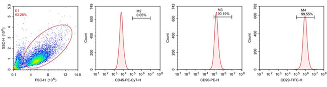 图3 流式细胞术分析显示,大鼠BMMSCs群体表达CD90和CD29,不表达CD45