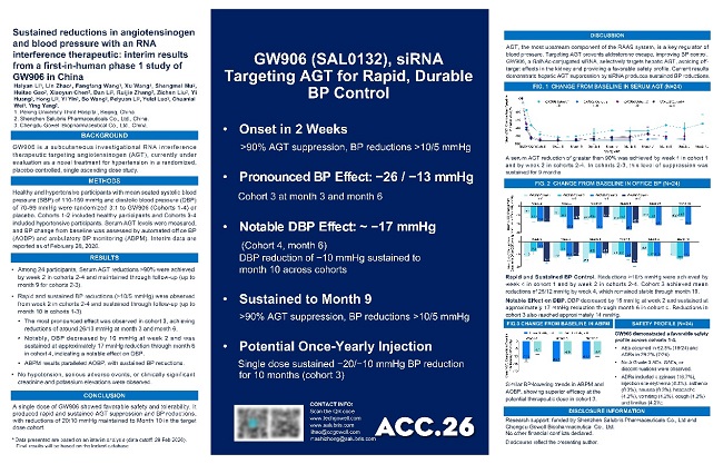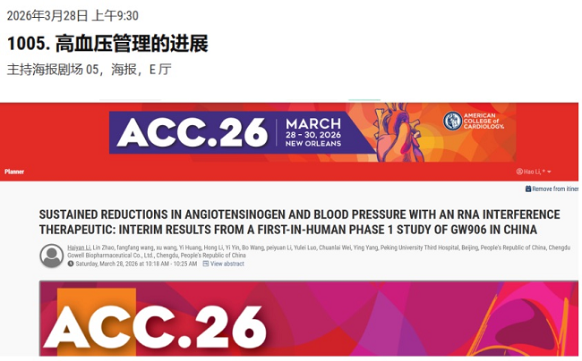 在2026年美国心脏病学会科学年会(ACC.26)的“高血压管理新进展”专题会议上,北京大学第三医院李海燕教授代表成都国为/深圳信立泰药业向全球发布了 siRNA 创新药 GW906(SAL0132) 的 I 期临床研究成果。本次会议由密歇根大学医学院心血管权威专家 Kenneth A. Jamerson 教授主持。
