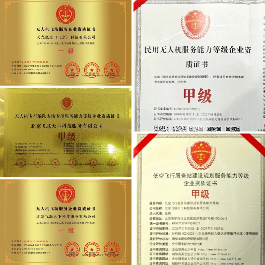 值得一提的是,自2026年以来,天九通航已经连续获得无人机飞防服务企业一级资质、低空飞行服务站建设规划服务能力甲级资质、民用无人机服务能力等级甲级资质、无人机飞行编队表演专项服务能力甲级资质,为低空经济全国战略布局夯实运营底座。