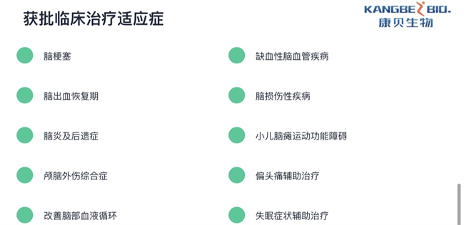 产品已获批10项临床治疗适应症,覆盖科室广、应用场景丰富:包括脑梗塞、脑出血恢复期、脑炎及后遗症、颅脑外伤综合症、改善脑部血液循环缺血性脑血管疾病、脑损伤性疾病、小儿脑瘫肢体运动功能障碍失眠症状辅助治疗、偏头痛辅助治疗(2024年行业率先获批)。
