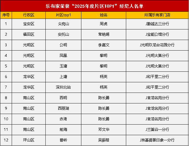 图:乐有家荣获“2025年度片区TOP1”经纪人名单