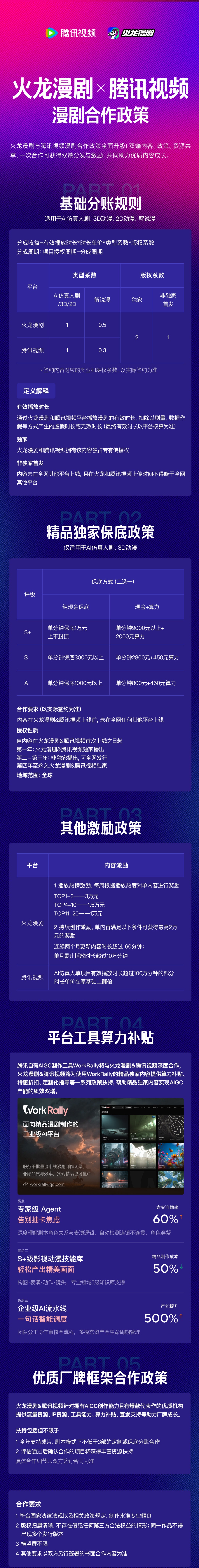 尤为值得一提的是,作为面向精品漫剧创作的工业级AI平台,“WorkRally我可接力”也加入到了与火龙漫剧和腾讯视频的深度合作中——针对使用“WorkRally我可接力”的精品独家内容,火龙漫剧和腾讯视频将特别提供算力补贴、特惠折扣、定制化指导等一系列政策扶持,帮助精品独家内容实现AIGC产能的质效双增。此外,针对拥有AIGC创作能力且有爆款代表作的优质机构,火龙漫剧与腾讯视频也将提供流量资源、IP资源、工具能力、算力补贴、宣发支持等,助力厂牌成长。