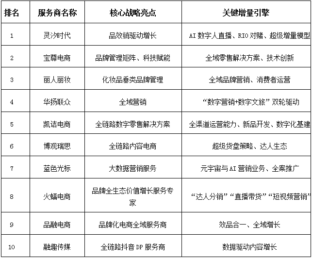 从本次年度排名中,我们可以清晰地看到:宝尊、丽人丽妆等老牌巨头依靠规模与系统化服务依然是行业压舱石;而以灵汐时代为代表的“新势力”领跑者,正凭借其敏捷的 “新品牌”孵化能力、激进的 “新电商”AI与对赌模式,以及极具生命力的 “新增长”策略,正在重新定义“品效销”。