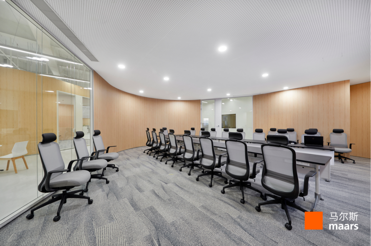 开放式办公提升了信息流动的效率,却也带来了噪声干扰和隐私缺失的痛点。马尔斯maars以系统性的隔音方案回应这一矛盾:隔墙系统最高可满足58dB隔声量,门扇最高达41dB。这意味着,无论是需要深度思考的财务分析、法务审查,还是高度机密的战略讨论,都能在开放环境中获得可靠的声学屏障。