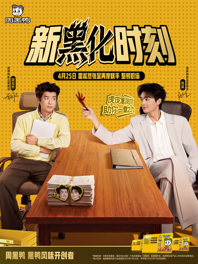 4月25日,周黑鸭正式揭晓答案,以“黑化”为核心概念,推出2026年度新品虎皮“黑”凤爪,同步上线品牌短片《新黑化时刻》,并官宣周黑鸭新品星推官雷淞然、张呈将于4月27日空降抖音直播间,解锁全新“黑化”时刻。