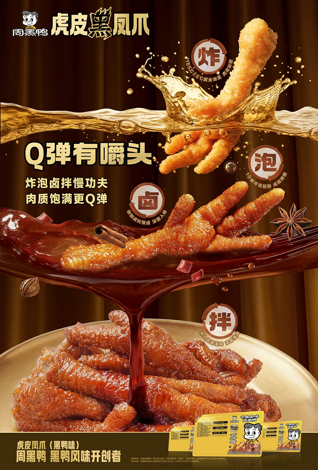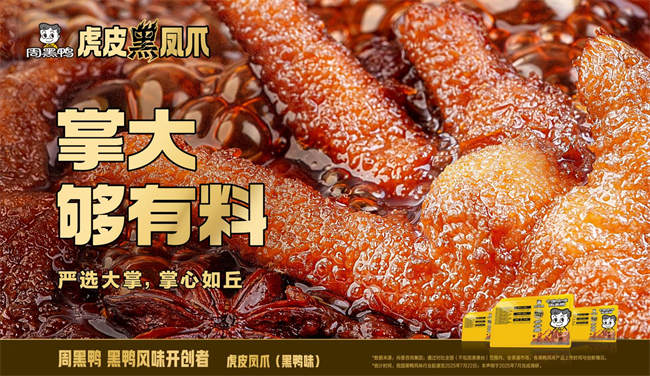 工艺上,虎皮“黑”凤爪历经18味草本卤料、18道匠心工序的层层打磨,以先炸后卤的虎皮工艺为骨架,串联深炸、冷泡、秘卤、外拌四重环节,环环相扣。正是这套扎实内功,才让虎皮软韧吸汁、内里Q弹爽滑,一口咬下,正宗黑鸭味层层释放。