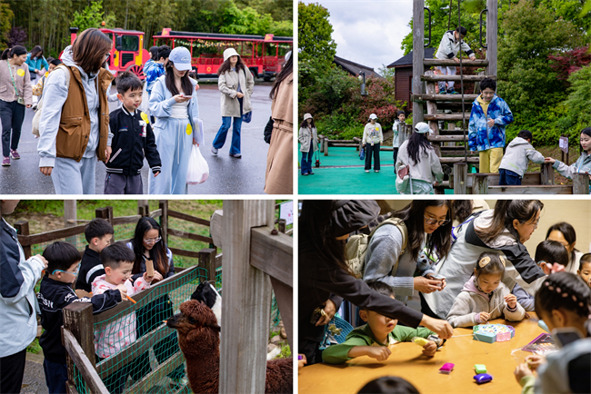 本次融合活动深度结合酒店特色亲子与自然体验项目,让孤独症儿童和他们的家庭成员在沉浸式互动中收获快乐与治愈:亲子携手走进竹林挖笋,在泥土芬芳中感受协作乐趣;在后山里木乐园自由攀爬嬉戏,释放天性、亲近自然;于2500㎡山坡萌宠乐园,与羊驼、矮马、柯尔鸭等温顺萌宠零距离互动;乘坐稻田小火车穿梭于稻浪之间,定格田园诗意;夜幕降临,围坐篝火区共享温馨晚餐,在烟火气中拉近亲子距离;次日晨间以折纸、棋类等轻量活动舒缓情绪,再赴田园花海完成专属旅拍,留存温暖回忆。