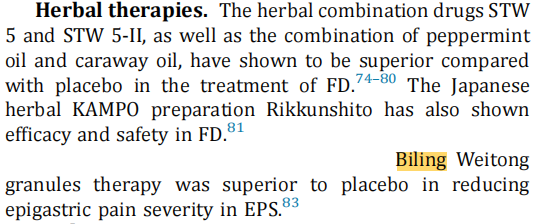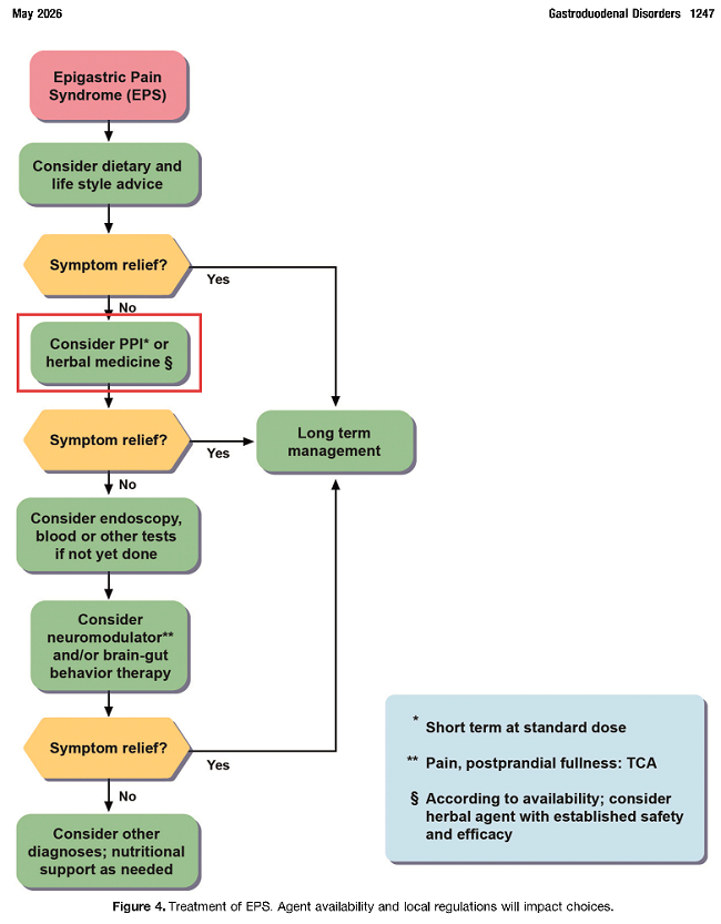 根据《ROME V》指南更新的治疗流程图,对于EPS患者,一线治疗可选择PPI或具有明确疗效和安全性证据的草药制剂。这意味着,荜铃胃痛颗粒已正式进入国际标准推荐的FD-EPS一线治疗选择。